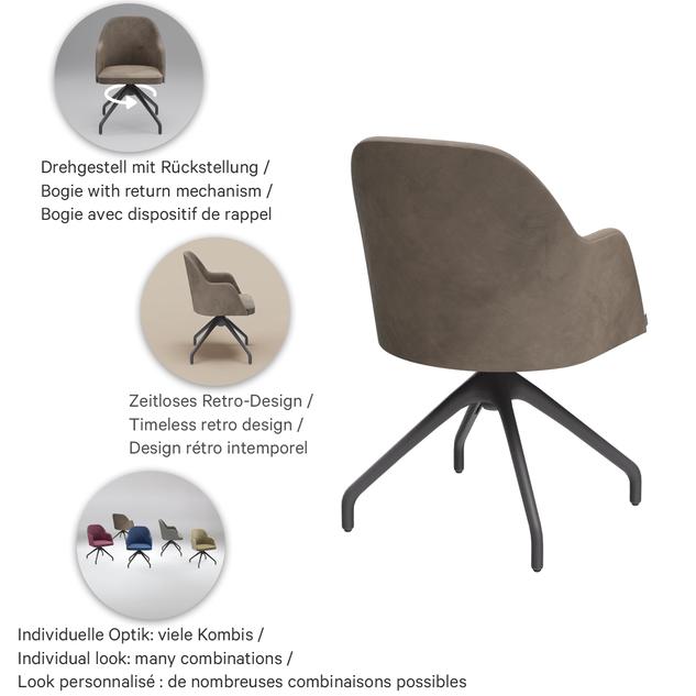 Zeitlos, klassisch und mit klarer Retro-Note: Der Polsterschalenstuhl Hada passt in Restaurant, Bar oder Hotel-Lounge – wahlweise mit oder ohne Armlehnen. Die komfortable Polsterschale ist in den Bezugsstoffen Cosy und Minea erhältlich. Für den Look stehen drei Holz-Untergestelle in Meranobraun, Eiche oder Schwarz mit Messingsocken bereit, alternativ ein schwarzes Metallgestell. Praktisch im Betrieb: Das schwarze Drehgestell mit Rückstellung richtet sich nach dem Aufstehen automatisch aus, wirkt sofort aufgeräumt und spart Handgriffe im Service. Gleichzeitig erleichtert die Drehfunktion das Hinsetzen und Aufstehen und reduziert Stuhl-Schieben – leiser und bodenschonender.- Zeitloses Retro-Design: Hada wirkt klassisch hochwertig und passt in Restaurant, Bar und Hotel-Lounge