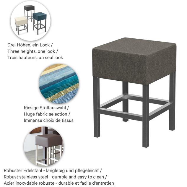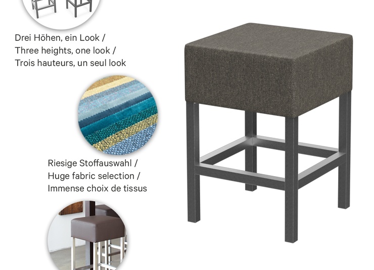 Durch sein geradliniges Design passt Yes in nahezu jedes Ambiente. Das Modell ist als Hocker, halbhoher Hocker und Barhocker erhältlich. Das Sitzpolster ist in mehreren Farben und Stoffen erhältlich, das Gestell besteht aus matt gebürstetem Edelstahl.Artikelnummer