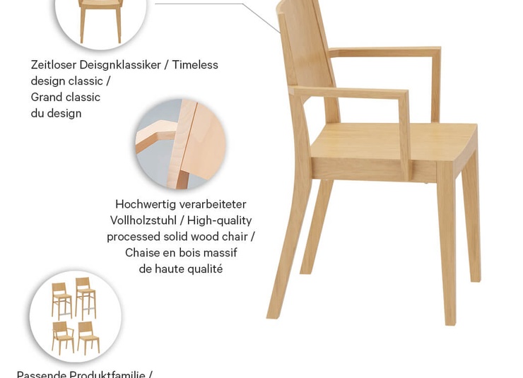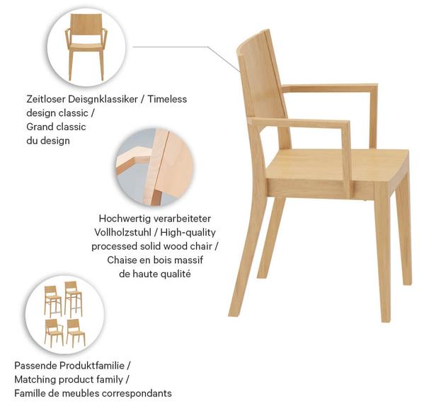 Ein Multitalent unter den Stühlen: Das Modell Quin - erhältich in Eiche Natur oder in Buchenholz in den Farben Schwarz und Nussbaum - macht durch seine hochwertige Verarbeitung und kantige Formensprache in nahezu jedem Ambiente eine gute Figur. Quin ist als Stuhl mit oder ohne Armlehnen und als Barhocker - halbhoch oder hoch, mit oder ohne Edelstahl-Trittschutz - erhältlich. Alle Varianten können optional mit Sitzpolster ausgestattet werden und sind stapelbar.Artikelnummer