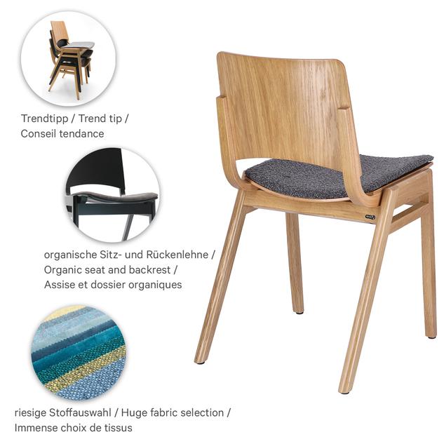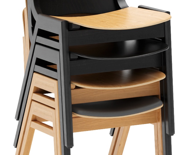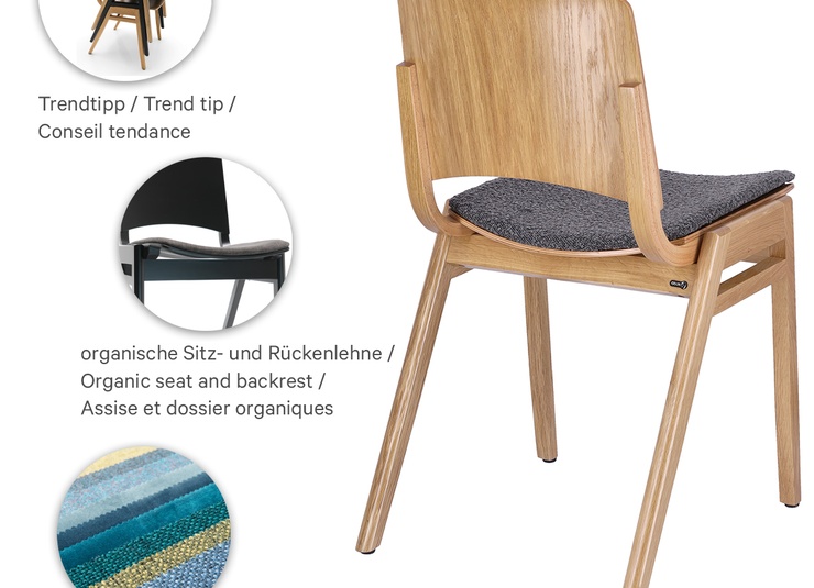 An einen Schulstuhl erinnert das in europäischer Handwerksqualität gearbeitete Modell Baldur aus transparent lackiertem Buchen- oder Eichenholz. Die A-Form des Gestells und die abgerundete Sitzfläche und Rückenlehne sind charakteristische Merkmale des angesagten Retro-Looks. Baldur ist optional mit einem Sitzpolster oder mit Sitz und Rücken aus Eichenholz in Kontrast zu einem schwarz lackierten Buchenholzgestell verfügbar. Beim Sitzpolster stehen die Farben Minea braun oder Gordon hellgrau zur Auswahl. Das Modell ist stapelbar( bis zu fünf Stück) und durch sein vergleichsweise geringes Gewicht gut geeignet für die Bestuhlung von Veranstaltungsräumen.Artikelnummer