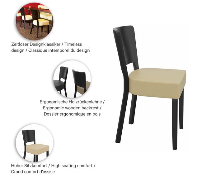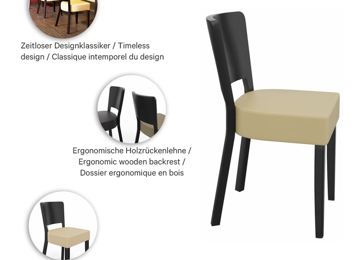 Weich gepolstert sitzt man auch auf dem Modell Delia im Restaurant- und Barbereich. Delia ist in Buchenholz Natur, Nussbaum und Schwarz und in vielen Bezugsvarianten erhältlich.Artikelnummer