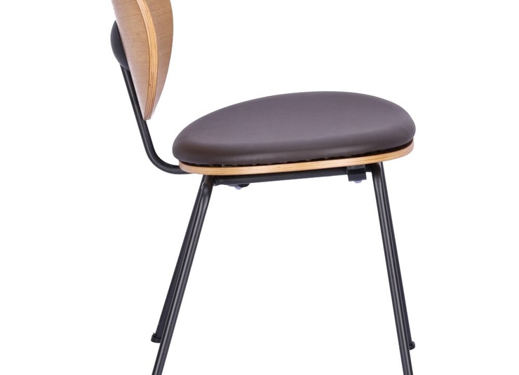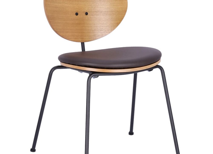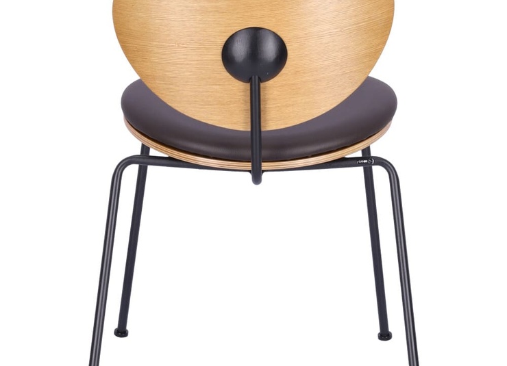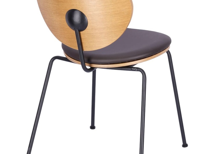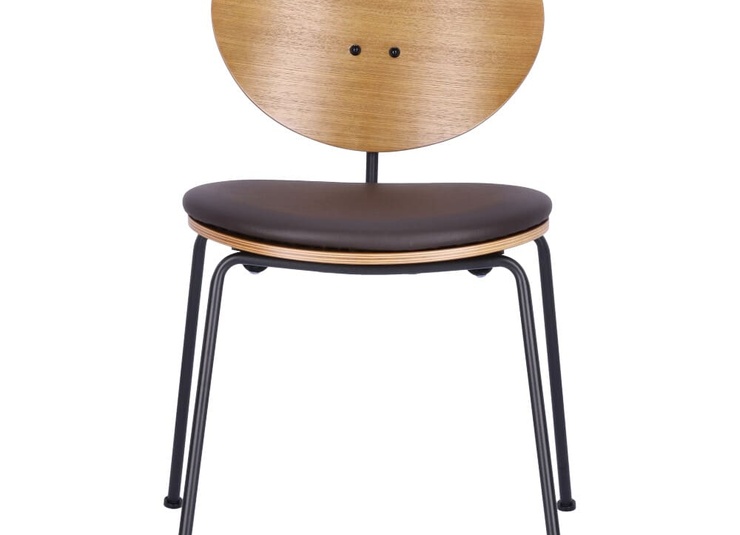 Eine runde Sache: Der stapelbare Stuhl Ovni besticht durch sein reduziertes Design. Das Gestell aus matt schwarz pulverbeschichtem Stahl wurde bei diesem Modell mit einer hölzernen Sitzfläche und Rückenlehne aus in Smoke gebeiztem und lackiertem Eschenholz kombiniert. Für die Sitzfläche gibt es optional ein Kunstleder-Polster, das in den Farben Caffeebraun und Schwarz verfügbar ist - in dieser Ausführung ist der Stuhl nicht stapelbar.Artikelnummer