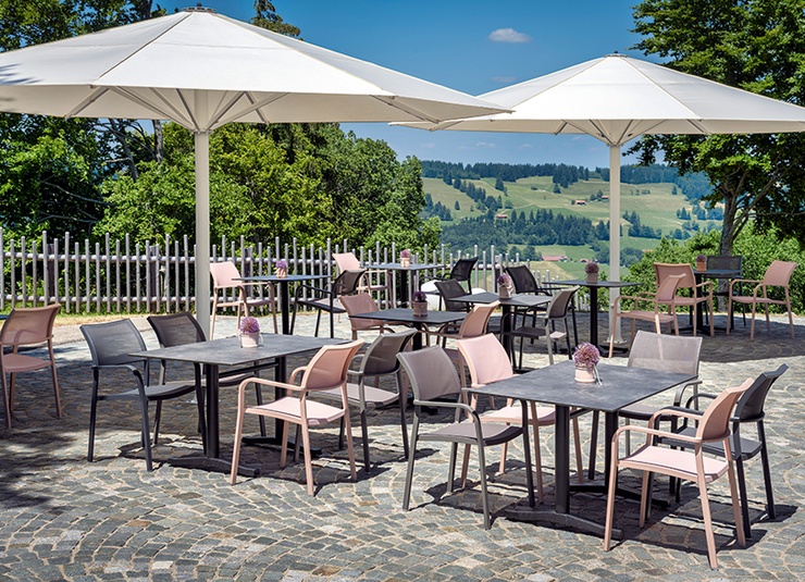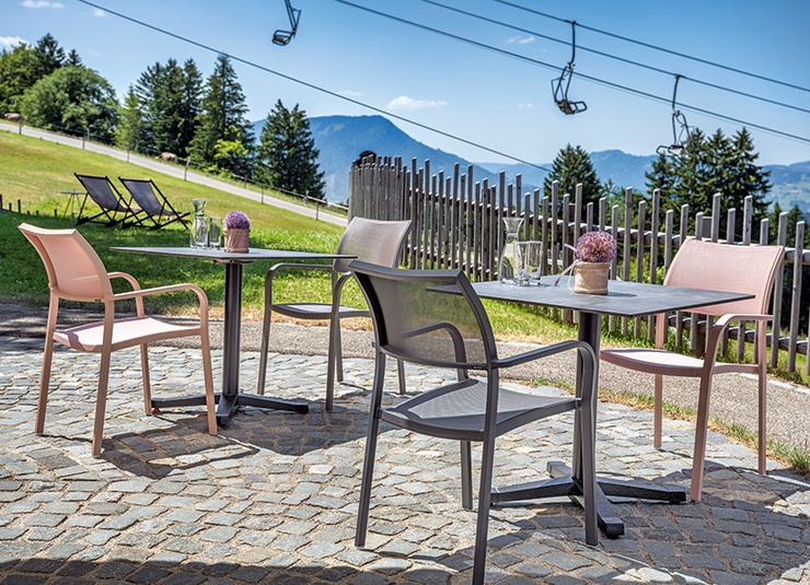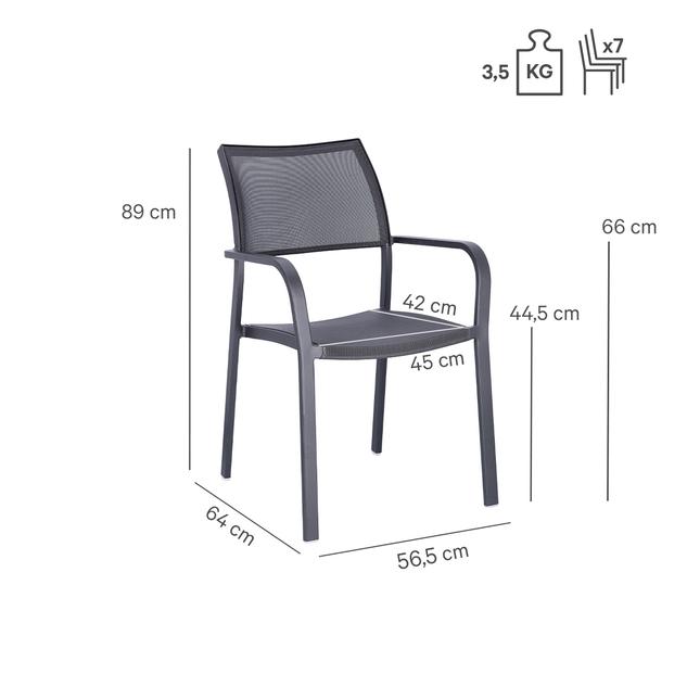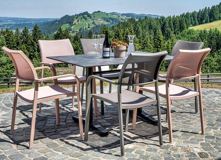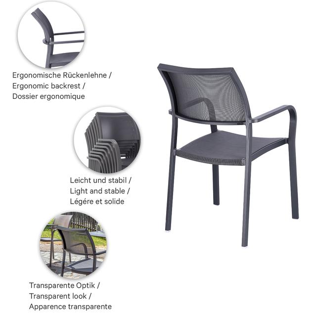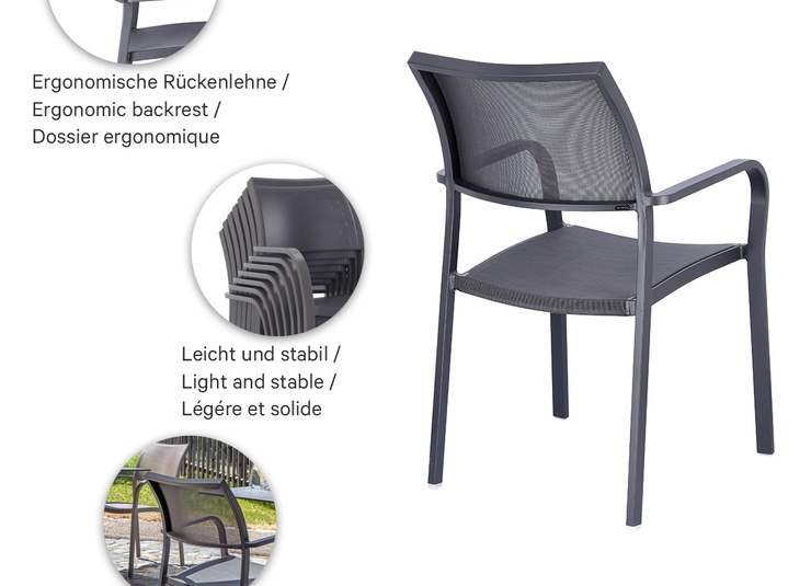 Robust und gemütlich: der Armlehnstuhl Alexis. Durch seinen hohen Sitzkomfort ideal für den Outdoor-Bereich von Gastronomen. Seine geschwungene Form und die weichen Kanten ermöglichen ebenfalls eine gute Anwendung im Health & Care, sowie Wellness-Bereich. Das robuste Gestell ist aus pulverbeschichtetem Aluminium. Sitz- und Rückenfläche bestehen aus einem atmungsaktiven und schnelltrocknenden Mesh-Gewebe. Leichtes Gewicht und als stapelbarer Armlehner (bis zu 6) besonders platzsparend.Artikelnummer