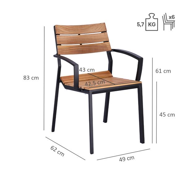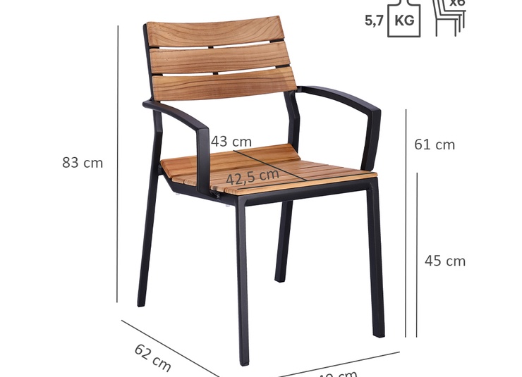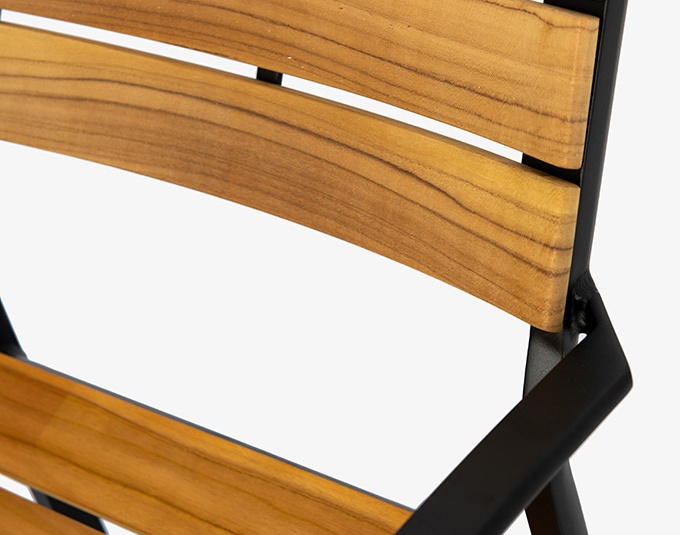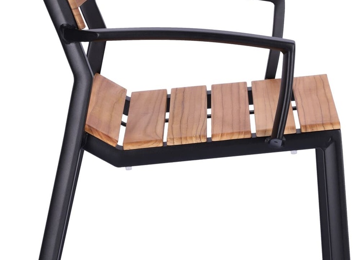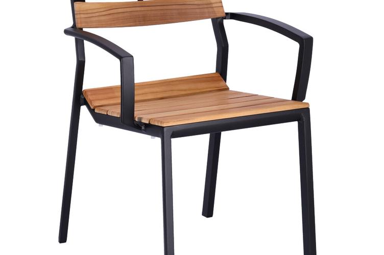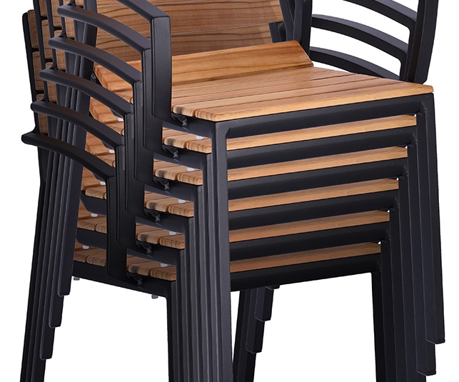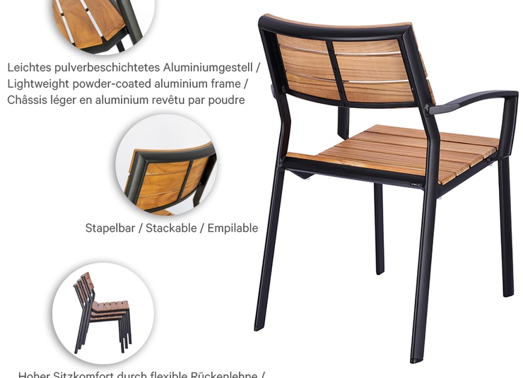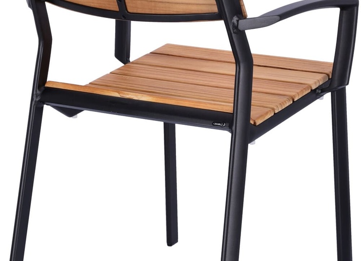 Das stapelbare Modell Tadeo – erhältlich als Stuhl und Armlehnstuhl – wird sowohl im Außen- als auch im Innenbereich zum absoluten Hingucker. Durch die Kombination aus einem schwarz pulverbeschichteten Gestell aus Aluminium und einer Sitzfläche und Rückenlehne aus unbehandeltem Teakholz wirkt Tadeo elegant und modern zugleich. Die gerundete Lehne bietet einen besonders hohen Sitzkomfort.