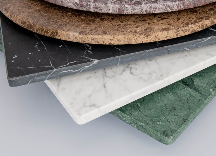 Für einen Tisch mit besonders edler Optik: unsere Tischplatte Cassius aus Marmor. Die natürliche Oberfläche von Cassius ist seidenmatt geschliffen und mit einer wasserbeständigen Holzunterplatte versehen. Letztere weist zur leichteren Montage bereits Gewindeeinsätze auf. Erhältlich in jeweils einer quadratischen sowie runden Ausführung und verschiedenen Größen. Ideal für Restaurants, Cafés, Bar und Hotels. Die Farbvarianten Nero Marquina und Bianco Carra sind für den Einsatz im Außenbereich geeignet, während sich die Farben Perlino Rosato, Verde, Rosso Levanto und Emperador Dark für Innenbereiche eignen. Die Marmorplatte ergänzt sich hervorragend mit dem Tischgestell T12 Slim. Jetzt entdecken!
